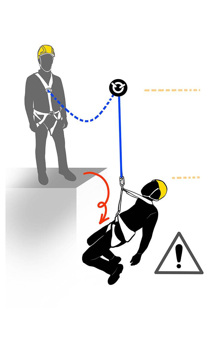 In case of a fall where the worker loses consciousness or is incapacitated, inert suspension in the harness presents a mortal danger requiring urgent treatment. Work teams must be equipped and trained to quickly evacuate an injured team member. - Evacuating a victim without assistance: