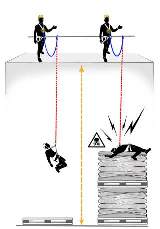 In case of a fall where the worker loses consciousness or is incapacitated, inert suspension in the harness presents a mortal danger requiring urgent treatment. Work teams must be equipped and trained to quickly evacuate an injured team member. - Evacuating a victim without assistance: